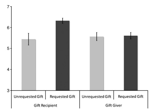 Francesca Gino and Francis Flynn showed in a series of experiments that gift givers tend to appreciate requested gifts less or at best the same as unrequested gifts. But unrequested gifts are remarkably often gifts that are not that appreciated by the recipient. The result is that on average the receiver of a gift appreciates a requested present more than an unrequested one.
