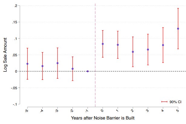 If there are noise reduction measures put in place, house prices in the areas that have seen noise levels decline immediately jump. The study finds that house prices within 100m of a new noise barrier jump by 6.8% in the year after the barrier is installed. Extrapolated to the whole United States, they estimate that the nationwide cost of noise pollution in the form of lower property values is some $110bn, which could be unlocked if communities were to build noise barriers.