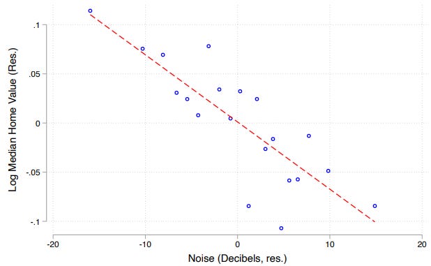 Enrico Moretti and Harrison Wheeler looked at the correlation between house prices and ambient noise levels. No surprises there. The more noise, the less valuable the house.