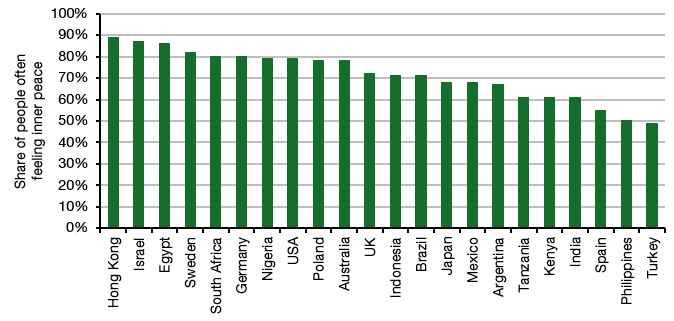A group of researchers around Tim Lomas from Harvard piggybacked on the Global Flourishing Survey, which asked more than 200,000 people in 22 countries over five years to rate how they feel about several aspects of life. One item was the question: “In general. How often do you feel you are at peace with your thoughts and feelings?”