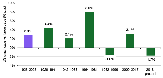 Just look at the split of US small-cap vs. large-cap performance by 20-year periods below. While small-cap stocks outperformed for every 20 years between the 1930s and 1970s, they underperformed significantly in the last 20 years of the 20th century and again since 2018. Indeed, if you had invested in US small caps over the last 40 years, you would barely have managed to keep pace with large-cap stocks.