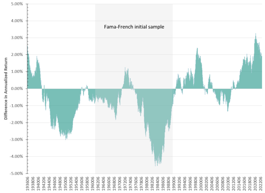 This is why I am always sceptical when I see people quote the Fama-French data of factor performance since 1926. None of us has been an investor since 1926, and even for endowments and pension funds, 100 years is an awful long time to wait until your thesis comes true.