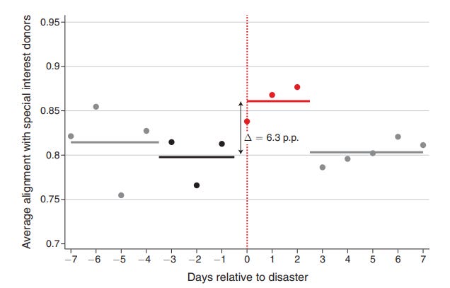 The chart shows how much a politician’s vote in Congress aligns with the interests of their largest donor during the two weeks around a natural disaster. In the three days after a disaster strikes, politicians increase their alignment with the special interest group sponsoring them by 6.3%. Vote like nobody’s watching, one could say. And when nobody is watching, moral hazard strikes and politicians shift their vote in favour of the people who give them the biggest incentive to vote a certain way.