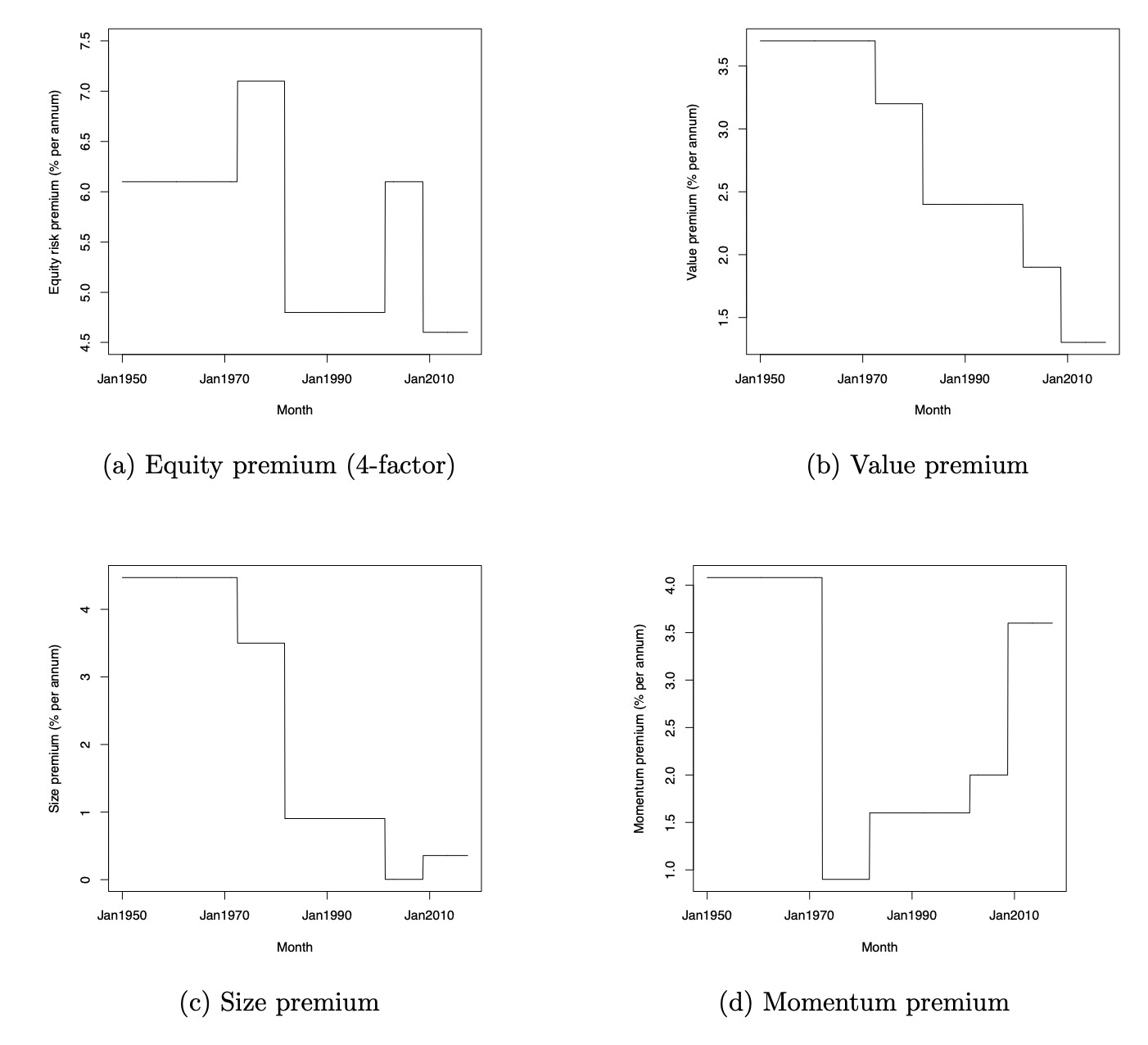 In this respect, I like the approach by Simon Smith and Allan Timmermann who looked at 23,000 US stocks from 1950 to 2018 and calculated not just the risk premium for value stocks, small-cap stocks, and other factors over time, but also tried to identify breakpoints in the performance of these stocks. The chart below shows the identified breakpoints for risk premia since 1970. The four “regime changes” happened at the oil price shock in 1972 that triggered the high inflation era of the 1970s, the change in monetary policy by the Fed in 1981 and the switch to interest rate and inflation targeting under Volcker, the crash of the tech bubble in 2001 and the financial crisis and introduction of zero interest rates in 2008.