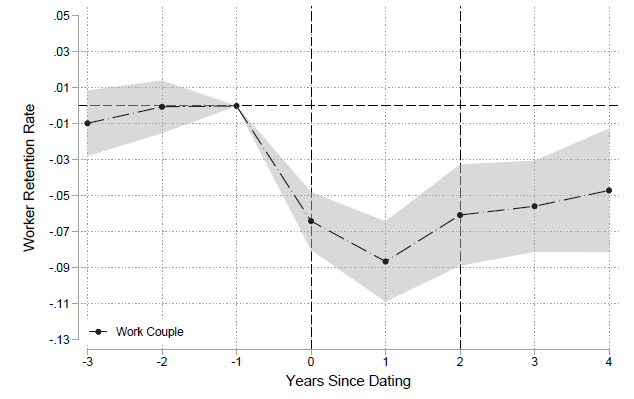 But it’s not just the subordinate who starts dating the boss who is at risk. If a manager and a subordinate start dating, the remaining subordinates of the manager tend to feel the pain as well. On the one hand, managers tend to promote their romantic partner at the expense of other employees. On the other hand, other employees may leave the company once they feel unfairly treated. The result is that firms where the boss is dating a subordinate see turnover among other workers increase by 6%. And as we all know (or should know), higher turnover is very costly for a firm.