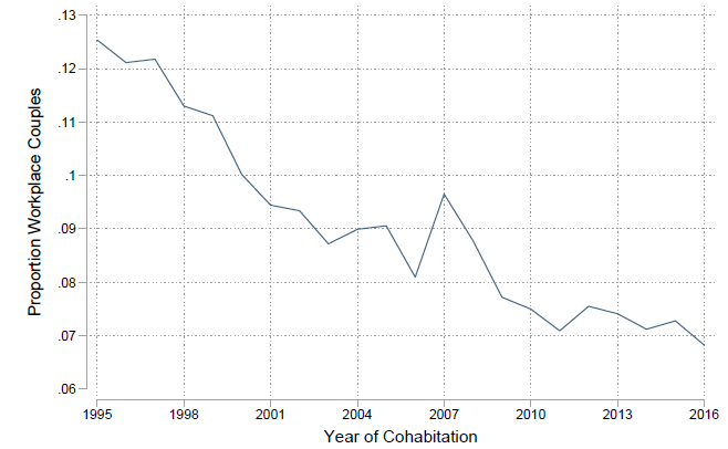 They document that couples are less and less likely to meet at the workplace. In the mid-1990s, about 12.5% of Finnish couples who moved in with each other had met at the workplace. By 2016, that had dropped to about 7%. Among these couples, about 16% of relationships were between a manager and a subordinate in the mid-1990s, declining to about 8% in 2016.