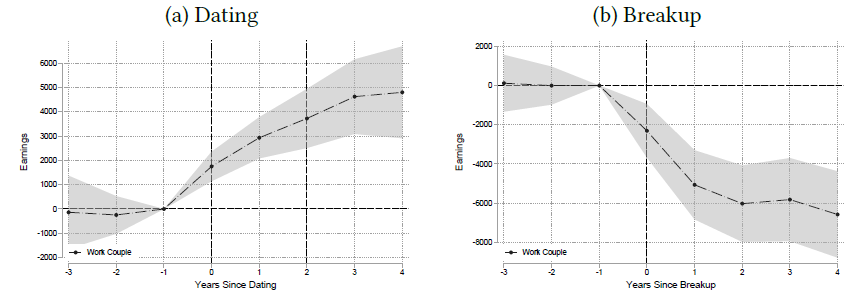 But if you decide to start dating your boss, be aware that while this might give you a leg up in the short term, in the long term, you may be worse off than before. Below is a chart that shows the increase in annual income of the person who starts dating the boss in the years after the relationship begins. On average, their income rises by 7% in the year the relationship begins. But look at the figure to the right, and you see that once the relationship ends, the subordinate sees their income drop by about 18%. And of course, a large part of that drop is due to the subordinate being fired or leaving the company for personal reasons, which often comes with a much larger income cut than the 18% average.