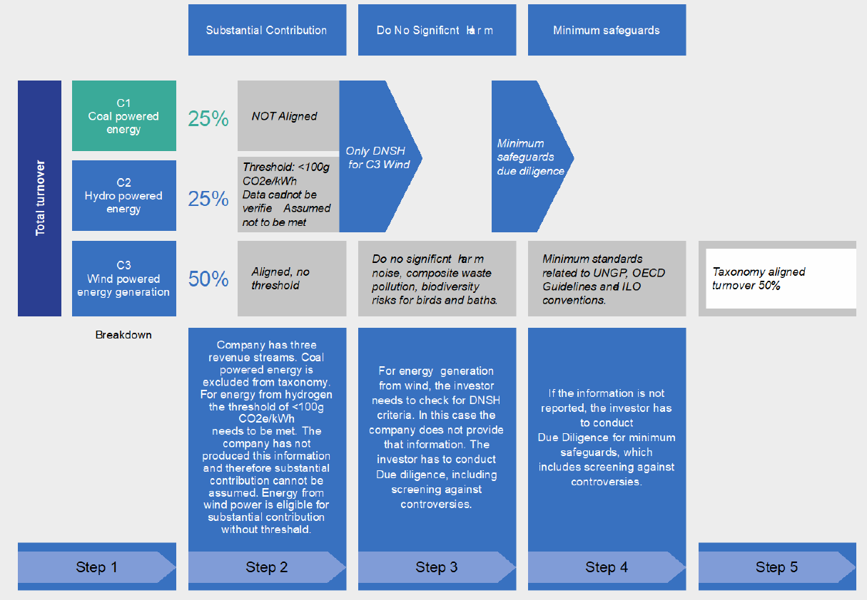 Only economic activities that pass all three steps are counted as sustainable economic activities. Investors who want to calculate their exposure to sustainable economic activities in their portfolios have to calculate the revenues generated by these activities in the companies in their portfolios. If the company does not provide the required disclosures, the investors have to do their own due diligence as shown in the flowchart below.