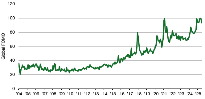 FOMO (Fear Of Missing Out, for the uninitiated) has been talked about in the investment world for more than a decade now as part of the explanation why US tech stocks, cryptocurrencies and meme stocks have been doing what they are doing. So, Bonaparte decided to design a simple indicator that aims to measure global FOMO and see if that can forecast or at least explain stock market behaviour.