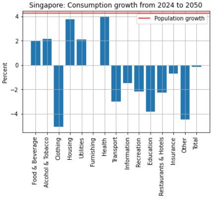 Finally, if you want to have a really complicated example, take a look at Singapore, where the population is ageing but also growing. These make for a complete mix of projections with some consumption categories expected to increase (healthcare, housing) and others expected to decline (education, clothing).