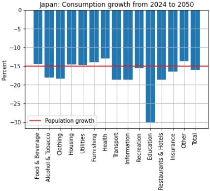 Take, for instance, Japan below. This is a society that is already quite old but continues to age further. The result is that the projected decline in the Japanese population of 15% translates into a similar 15% drop in consumption across most categories. Healthcare holds up a little better than the rest, but the differences are small.