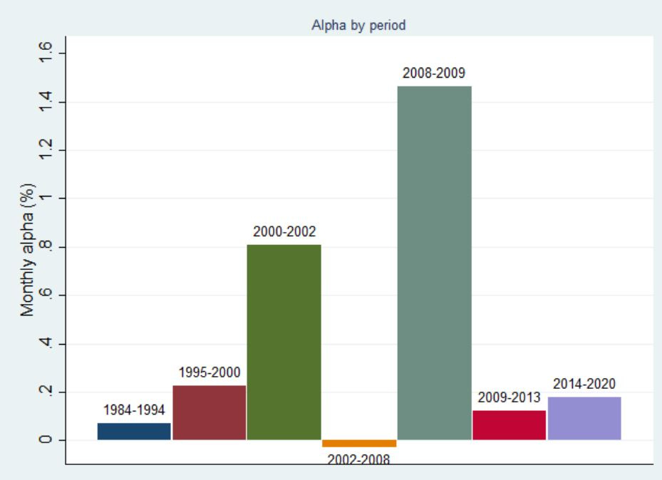 But if measuring employee satisfaction becomes easier to do and more investors use it, shouldn’t that lead to a lower return on that factor? It turns out that this so far is not the case. Employee satisfaction is still a driver of stock market outperformance. Even ten years after the publication of the original study, the outperformance of the best companies to work for remains roughly at the same level as in the original publication. However, by now we have a little bit more insight on the distribution of this outperformance over time and it seems like the outperformance is particularly high in times of crisis. During recessions like 2000 to 2002 and 2008 to 2009, the outperformance of companies with a highly motivated workforce is particularly strong.
