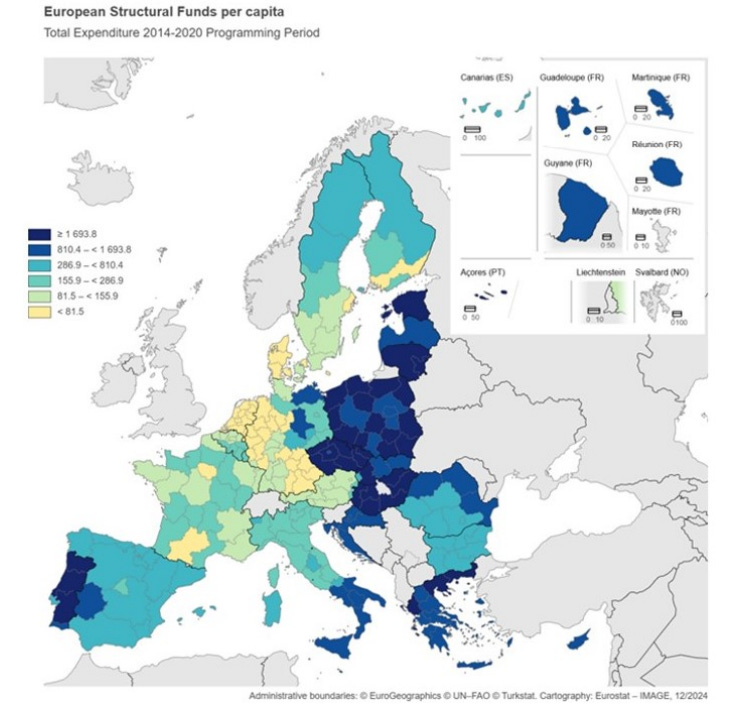 The EU has a series of funds that are together known as the European Structural and Investment Funds, which direct investments into poorer and less developed regions of the union. Since the late 1990s, the EU has spent more than 1 trillion euros on these funds to ‘level up’ the continent. The map below shows which parts of the EU have been receiving the most money from these funds (dark blue areas) and which parts have received less (yellow and light green areas).