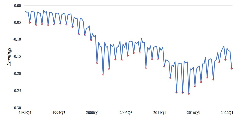 However, there is another calendar effect at play that I did not know until I read a paper by Oliver Binz and Martin Kapons. They document a distinct drop in earnings in the fourth quarter of a company’s fiscal year. The chart below shows the evolution of earnings before extraordinary items of US companies (excluding financials and utilities) from 1989 to the end of 2023. Note the fourth quarter results circled in red, which are, without exception, below the earnings released in the neighbouring quarters.