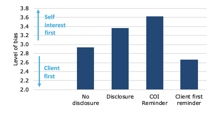 Another effect shown in the chart is that advisers become even more biased in their advice if they not only disclose their conflicts of interest but if they themselves are reminded of their conflicts of interest before they give advice (COI reminder in the chart above). This is meant to simulate a situation where the adviser is reminded by her boss or her company that selling Fund B is good for business. As the experiment shows, that is a sure-fire way to create biased advice that is not in the best interest of clients.