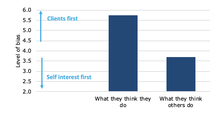 But when it comes to our own investments, we have to be aware that most of us aren’t experts and can bias our actions subconsciously. Take a look at the chart below which are the responses of financial professionals when asked about financial advice on Fund A and Fund B from the experiment above. The financial professionals were asked if their advice is biased and self-interested and if they think that the advice of their colleagues is self-interested. On average, the financial advisers thought that the advice they gave was not self-interested while they thought that their colleagues were giving biased advice.