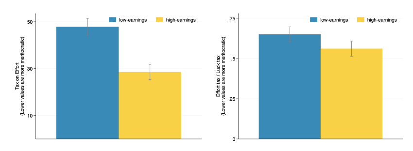 The right-hand chart shows that the relative level of tax on effort-based income vs. lottery-based income is also lower for lottery winners, which means that lottery winners think that taxes, in general, should be lower, whether wealth is based on effort or luck.