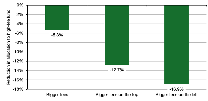 The final decision which funds to invest in were significantly shifted by these differences in salience. If fund fees were made more salient by using a larger font, investors reduced their investments in the high fee fund by 11.2% on average. The reduction was largest if fund fees were displayed on the left of the performance charts (i.e. when ‘read first’ in the Western world) and lowest if fund fees were displayed on the bottom.