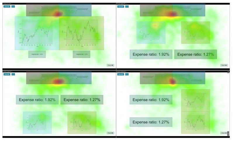 Then they tracked the eye movements of the participants, similar to another experiment I have written about in the past. Here is a graphic representation of the focus of attention by the participants in the different treatment conditions. By increasing the font size of the fees, the focus on past performance charts is reduced by 47% to 75% and the time participants focus on the fees charged by the funds is increased by 3% to 6%, depending on the position of the fee information.
