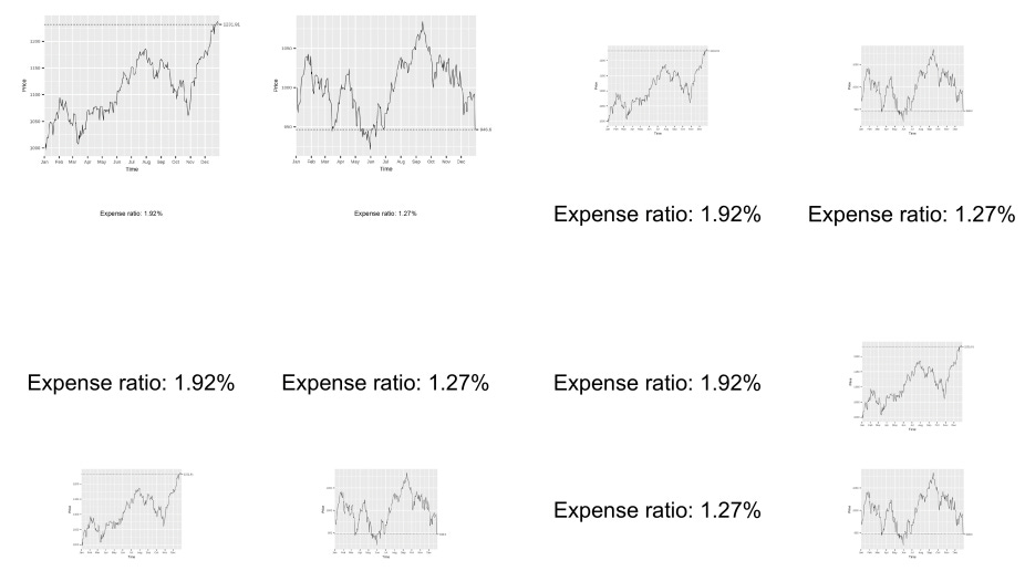 The authors of the study recruited 2,000 Americans and asked them to review simplified fund fact sheets that displayed both the fund fees and the performance track record of the funds. However, the size of the fees, performance charts and their position on the factsheet changed as shown in the figure below.