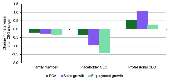 Then they looked at the transition from a family member CEO to the next CEO. They compared the performance of the family business in the two years before the transition with the two years after the transition. The chart below shows the differences in Return on Assets (ROA), sales growth, and employment growth depending on the type of CEO taking over.