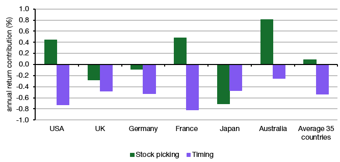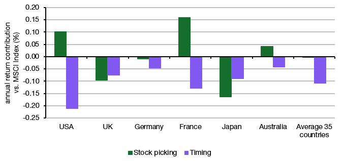 As you can see, market timing is still the primary driver of underperformance. Indeed, on average across 35 countries, it is the only driver of underperformance. Stock picking, meanwhile, is sometimes positive and sometimes negative, but on average does neither detract nor add to the performance of a fund vs. the MSCI.