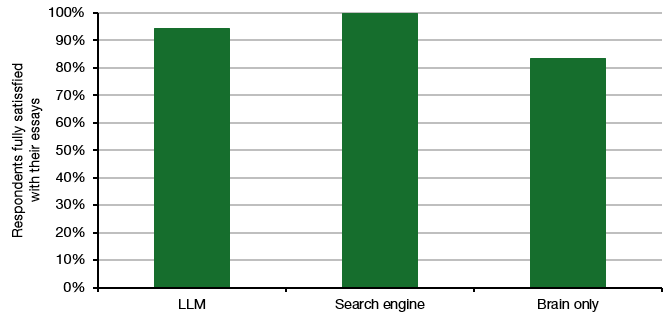 Yet, if you ask the participants how satisfied they were with the quality of their essays, the people who used ChatGPT or Google were, on average, more satisfied with the work they produced than the people who had no tools to help them.